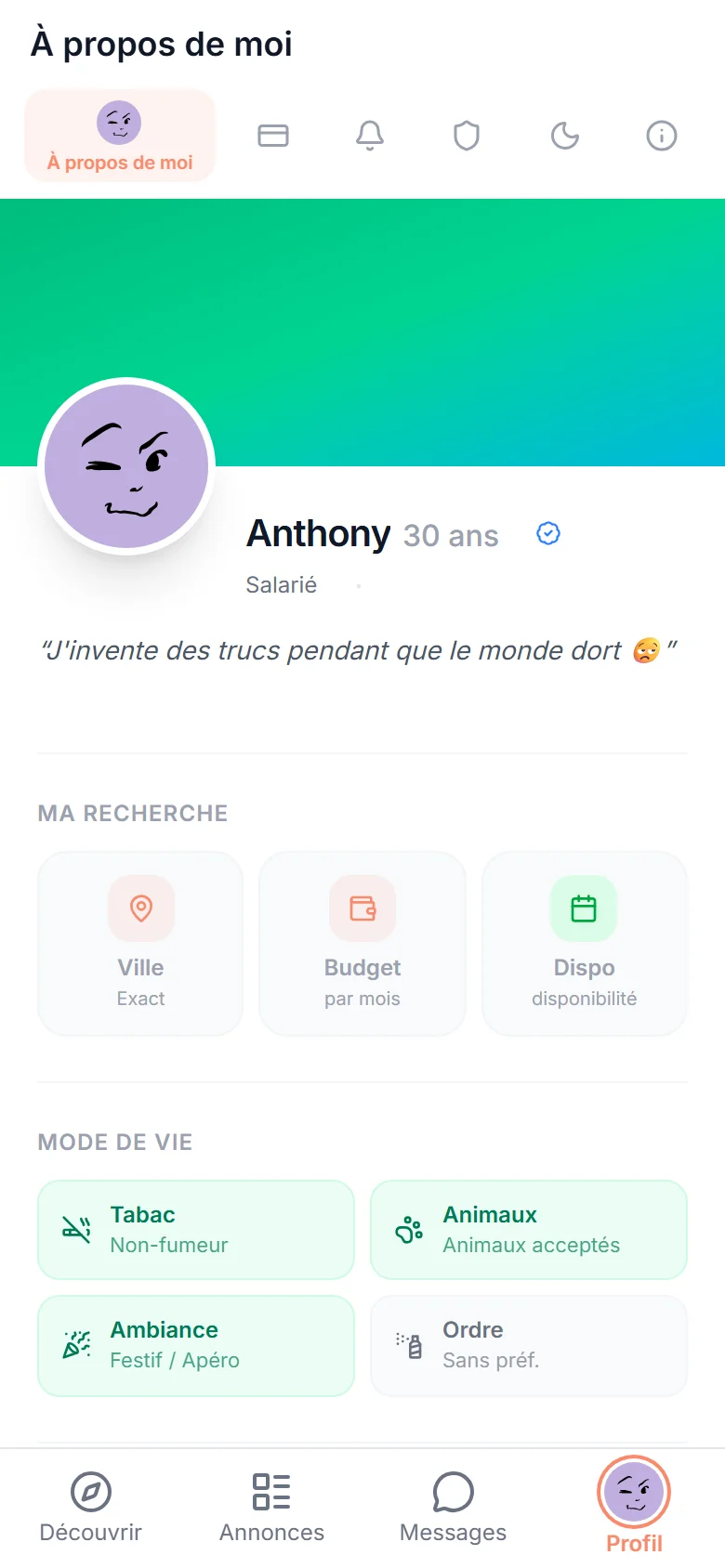 Rythme, ménage, invités, animaux... Ton profil en 2 minutes pour des matchs qui ont du sens.